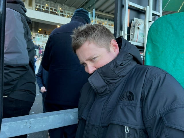 After all the numbers had been crunched the book lost €1900. It wasn't quite that bad as AK won €2000 with his personal punting. Not great on a busy day where you hope to get the wages not lose money after exes. Still, come on let's be positive with two days to go, it's far from over yet. I foolishly waited until after the last to get poor AK to pose for a blog photo which was in hindsight a schoolboy error. As you can see, just coming out of the other side of a Christmas cold and frozen wet he wasn't overly keen, but is a trooper and posed for one sort of, asked to sum up the day he told me ‘Today was whole lot of work for nothing’.