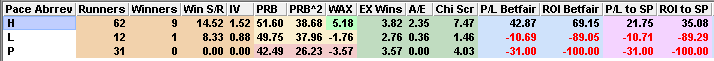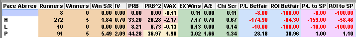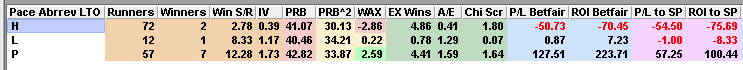 Proform’s software awards each runner a pace rating between 0 and 12 based on their last three runs (led = 4pts, prominent = 2pts, held up = 0pts) and those with a pace rating of six or higher (i.e. more likely to race up with the pace) have a modest recent record…