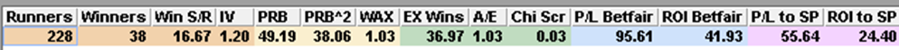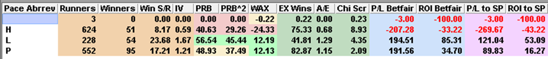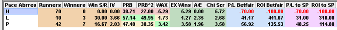 …Front-runners (L) had a 23.68% strike-rate and returned a big profit at SP (+£121.04), as did prominent (P) racers (17.21%, +£89.83 to a £1 level stake at SP). Hold-up (H) horses usually struggled, winning at a rate of just 8.17% and returning a loss of £269.67.