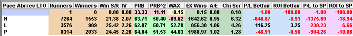 Willoughby suggests that the speed figure for those who won from the front last time out might be more reliable, because the good speed figure means that they didn’t receive an easy lead. He also suggests that horses who were behind early might have been flatted by a pace collapse. The following table shows the last time out running style of the winning handicappers who were now ranked top on LTO speed (L = led, P = prominent, H = held up)…
