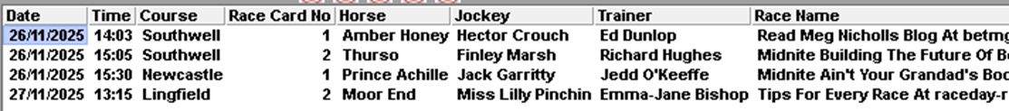…Amber Honey (third 3-1f), Thurso (sixth 13-2) and Prince Achille (2nd 100-30) were all beaten. Moor End runs tomorrow (November 27th).