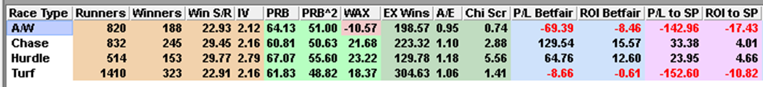 Let’s concentrate on those who made the running last time out and see if we can produce a profitable punting system. Splitting by race type makes interesting reading, with the Flat runners (A/WE and Turf) in the table below showing a loss but the jumpers did well..