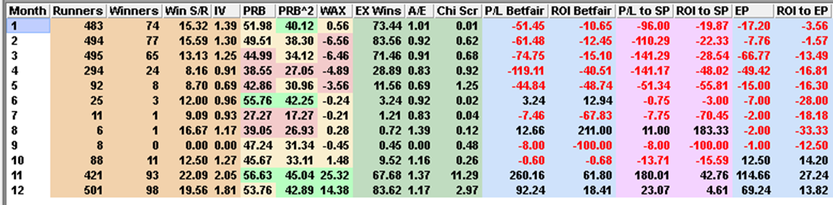 November was a profitable month thanks to 93 winners from 421 bets (22.09% strike-rate, +£180.01 to a £1 level stake at SP, +£260.16 at Betfair SP after 2% comm), while December also produced some healthy returns.