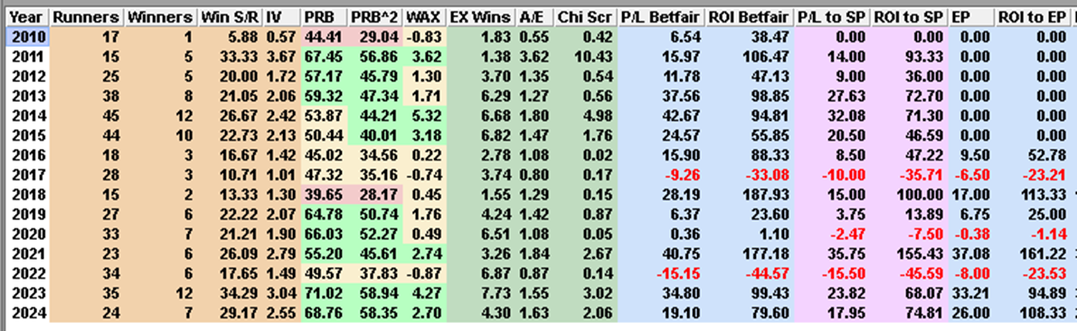 It’s possible that the dry start to October might put the trainer a week or two behind where she wants be with her horses at this time of year (2022 also featured a dry October) but it’s a punting system that I still intend to follow this term. It’s also worth wearing in mind that her last losing November with handicap chasers (2022) was followed by a very profitable December thanks to eight winners from 26 bets (+£27.75 at SP, +£35.15 at BSP).