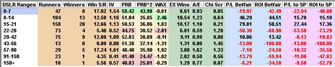 …take a look at the PRB (percentage of rivals beaten column) – apart from a blip with the 22-28 days period, the more recent the outing, the higher the figure. Lumping together all handicap runners who had raced in the past 21 days produced the following results…