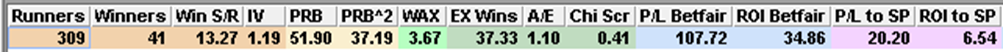 …41 winners from 309 bets (13.27% strike-rate) for a profit of £20.20 to a £1 level stake at SP (+6.54% on turnover). At Betfair SP the profit was £107.72 after 2% commission (+34.86%).